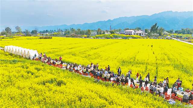 连日来,拾万镇隆平五彩田园千亩油菜花竞相绽放,每天吸引数千名游客漫步金色花海,体验花田火锅,尽享春日田园乐趣。(通讯员 瞿波 摄/视觉重庆)